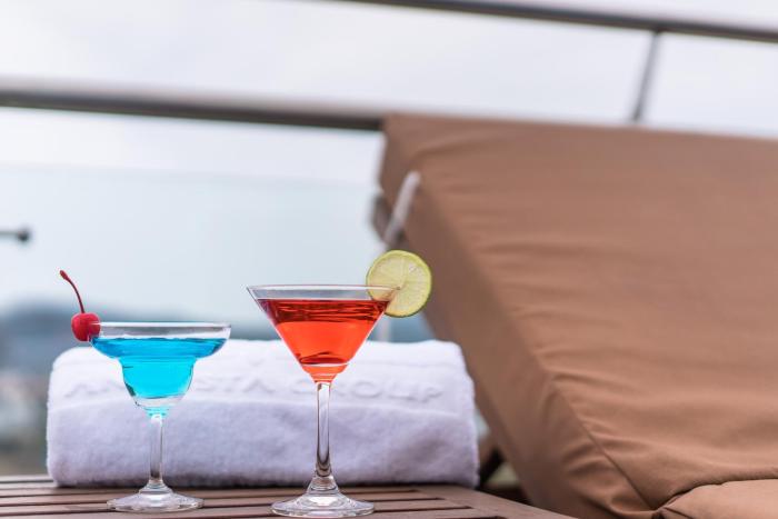 A variety of refreshing drinks await guests at the pool bar. A wellness area with massage treatments is available at the hotel.