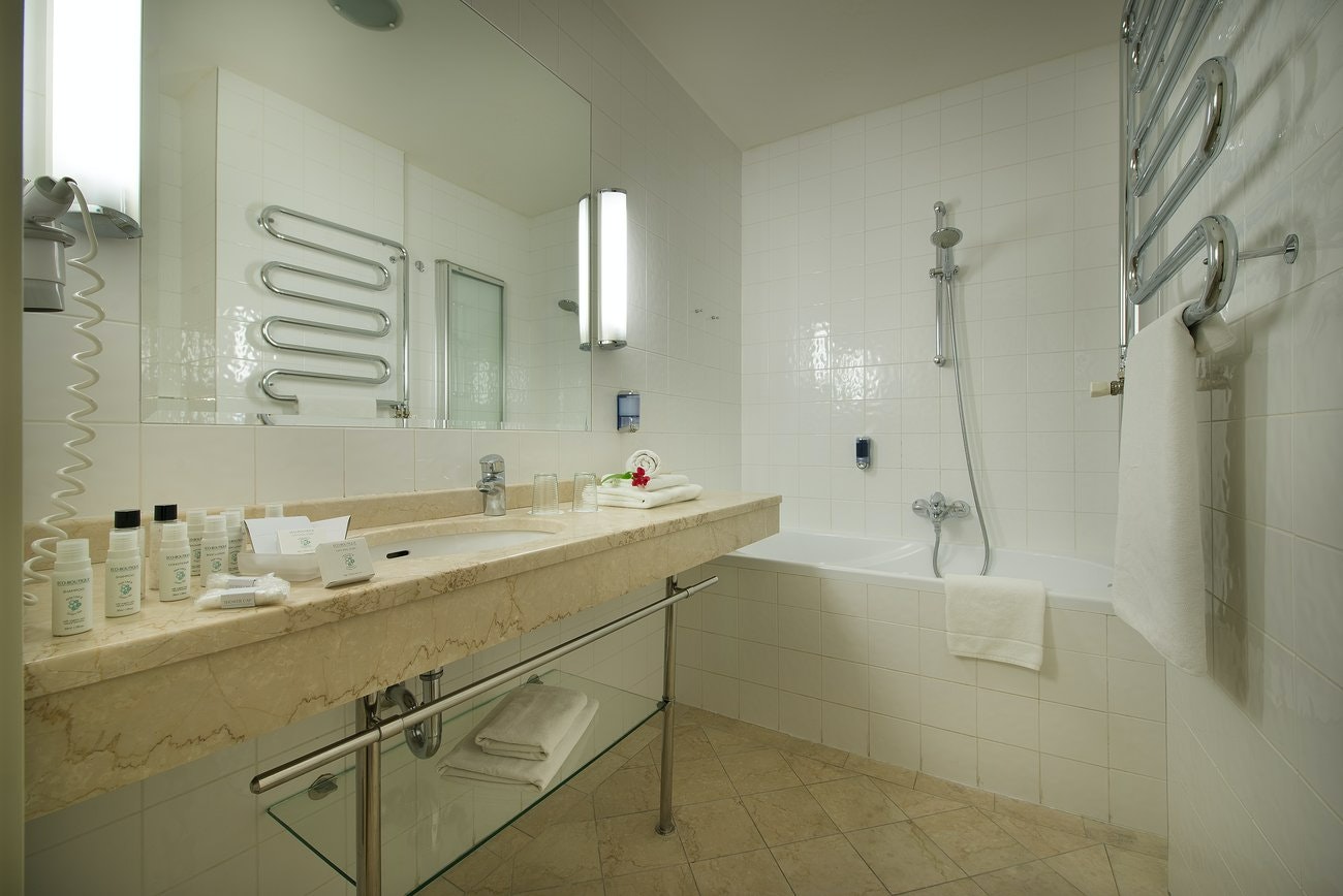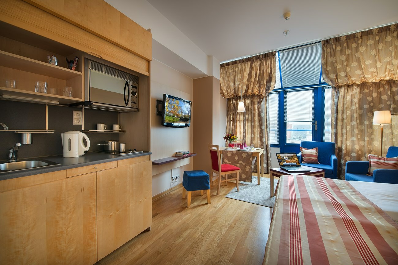 Air conditioning and central heating ensure that rooms maintain comfortable temperatures. Rooms include a double bed. A safe and a minibar are also available. There is a fully-equipped kitchenette with a refrigerator, mini fridge, microwave and tea/coffee station. A washing machine is provided for guests' convenience. A direct dial telephone, a television with satellite/cable channels, a radio and WiFi are provided as well. Slippers are included. A hairdryer and bathrobes are provided in the bathrooms, which include a shower and a bathtub. Wheelchair-friendly rooms with wheelchair-accessible bathrooms are also available at the hotel.