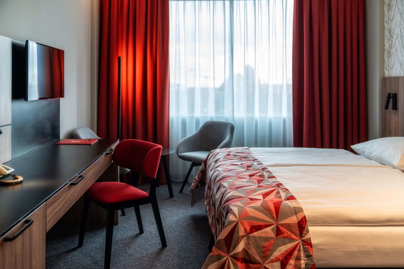 Rooms are equipped with air conditioning and individually adjustable heating. All rooms are carpeted and include a double bed or a king-size bed. Children's beds can be requested for younger guests. A minibar is provided. A refrigerator, a mini fridge and a tea/coffee station are standard features. An ironing set is provided for guests' convenience. A direct dial telephone, a television with satellite/cable channels, a radio and WiFi are provided as well. Bathrooms are equipped with a shower and a bathtub, as well as a hairdryer. Wheelchair-friendly rooms can be reserved. The hotel has family rooms and non-smoking rooms.