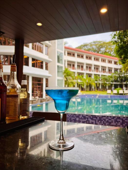 Guests can enjoy a refreshing swim in the outdoor pool area. A variety of refreshing drinks await guests at the pool bar.