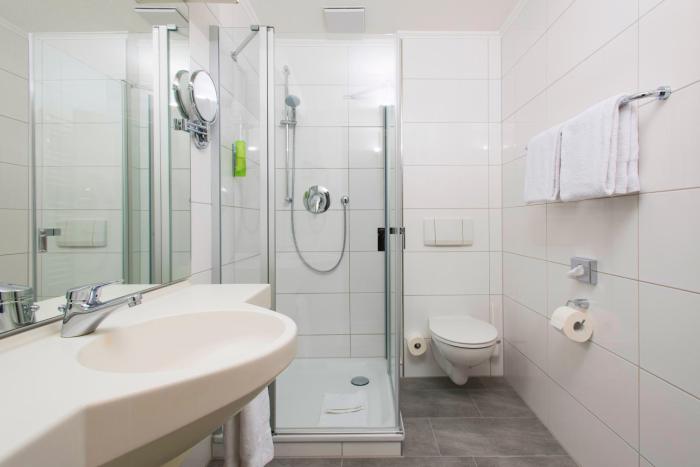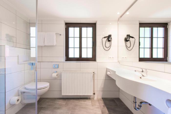 Rooms are equipped with individually adjustable heating. All rooms are carpeted and include a double bed. A desk is provided. Additional features include a mini fridge and a tea/coffee station. A direct dial telephone, a television with satellite/cable channels and WiFi are provided as well. Bathrooms are equipped with a shower and a hairdryer. Wheelchair-friendly rooms can be reserved. The hotel has family rooms and non-smoking rooms.
