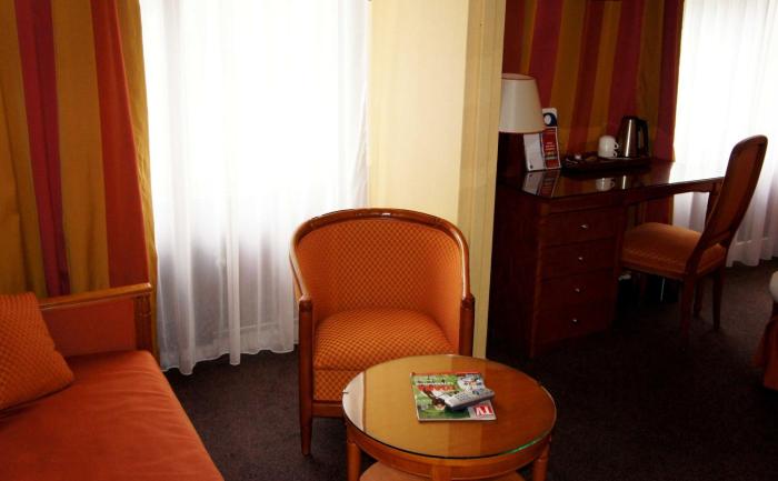 Spoke English. Clean room. Older type hotel, (elevator was a give-away) Few vacationers staying. Probably busy during the summer, as it boasts large lawn/gardens in the rear of the hotel, plus...