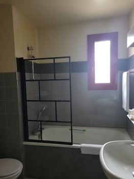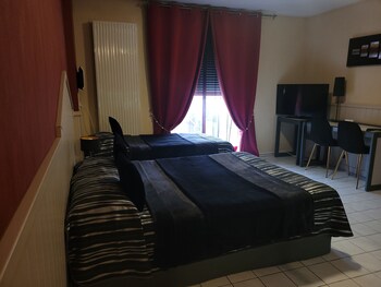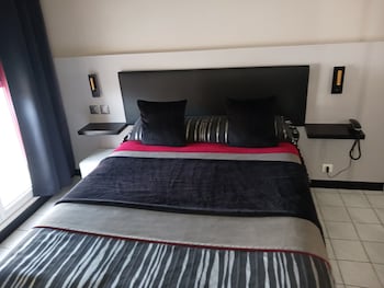 We spent one night here with my wife and two kids, on our way to the south of France. We had the family room, with two king size beds. Large room, good mattresses. The toilet made quite some noise...