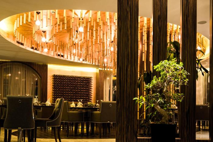 The hotel includes a restaurant and a dining room. A bed and breakfast package can be booked.