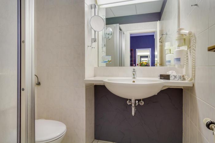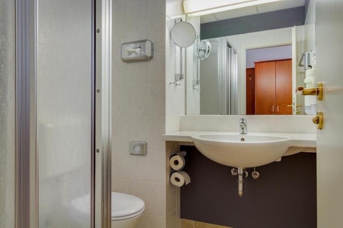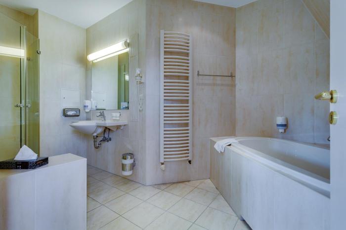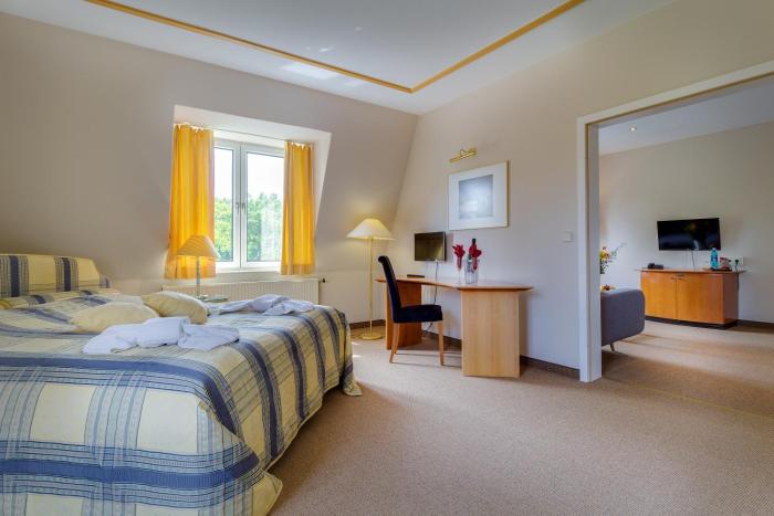 Rooms are equipped with central heating. The rooms have a queen-size bed and a sofa bed. Children's beds can be requested for younger guests. A desk is provided. A telephone, satellite television and WiFi are provided as well. A hairdryer and a vanity mirror are available in the bathrooms, which are equipped with a shower and a bathtub. Family rooms are available for parents with children.