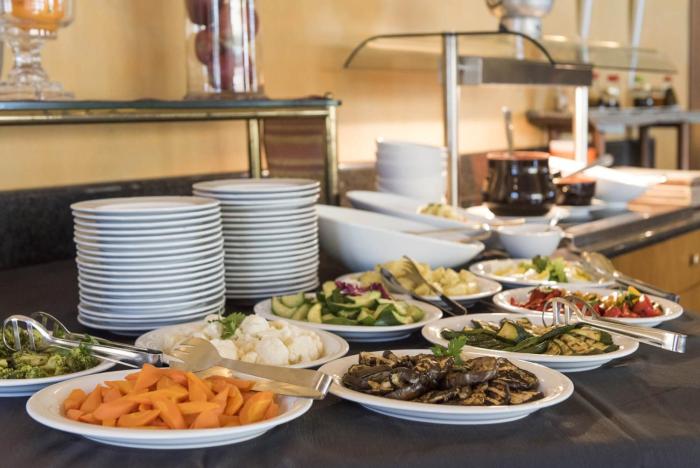 The dining area includes a restaurant and a bar. At breakfast, guests serve themselves at the generous buffet. Various dishes can be ordered à la carte for lunch and dinner.