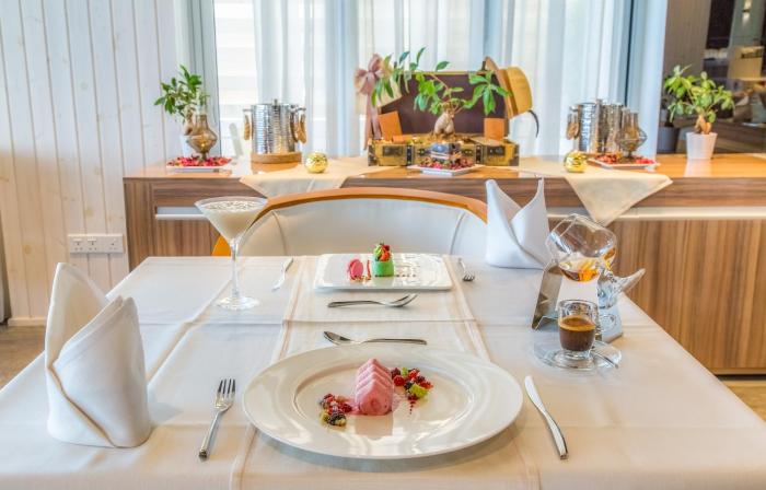 The dining area includes an à-la-carte restaurant and a bar. Half board can be booked. A generous breakfast buffet and dinner offer culinary delights every day.
