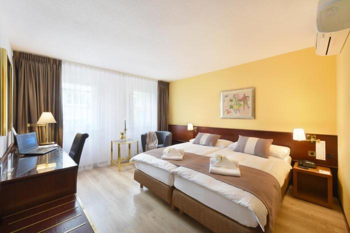 The hotel has 60 rooms, including 6 single rooms and 40 double rooms, which are located on 4 stories and are reachable by elevator. The friendly staff at the reception desk are happy to answer any questions. A safe, 24-hour room service, a laundry service, 2 conference rooms and a business center are available. Wireless internet access allows guests to stay connected while on vacation. There are also a number of shops that make for great strolling and browsing. Guests arriving by car can park their vehicles in the parking lot.